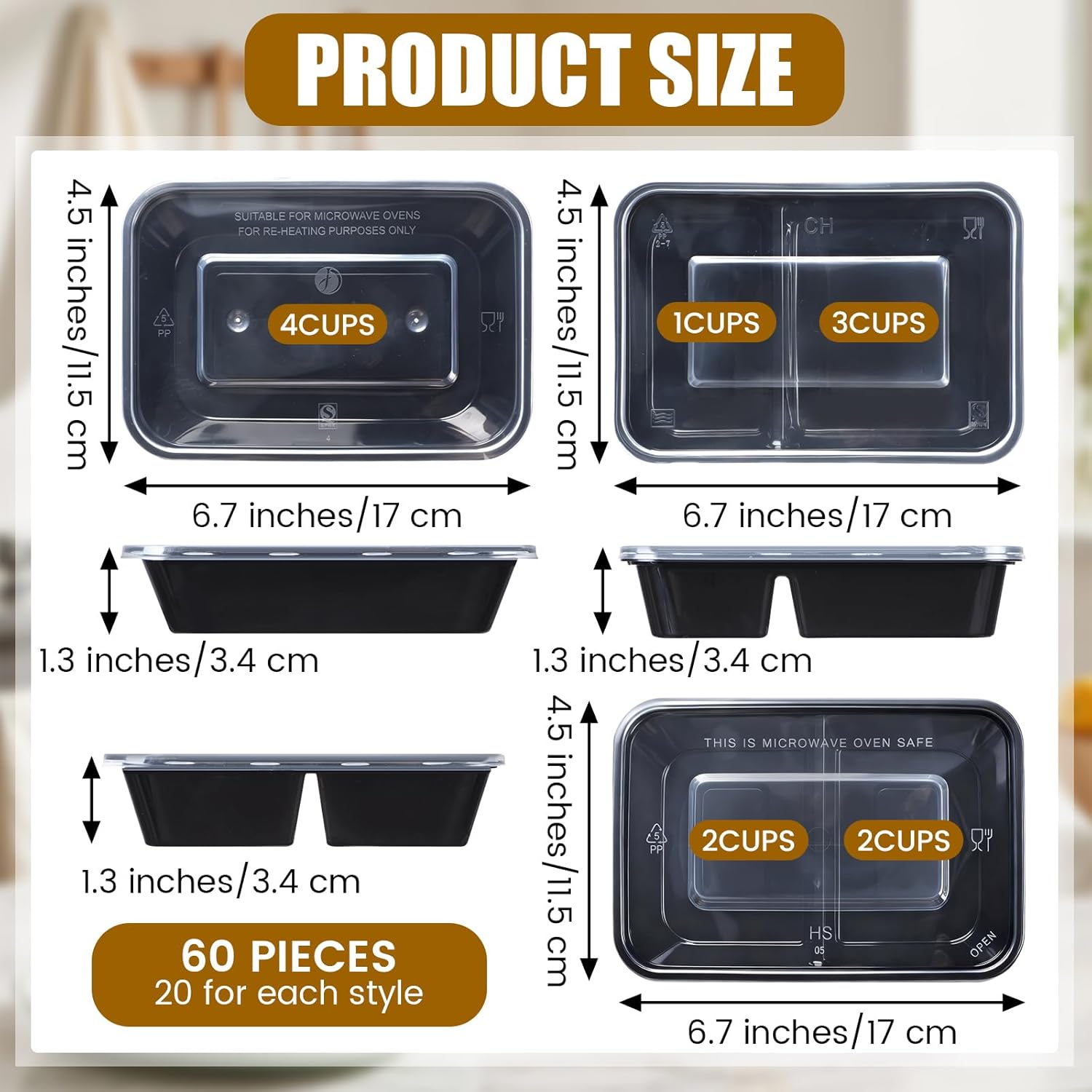- Affordable Set: Includes 20 single-compartment/4-cup containers, 20 double-compartment/3-cup containers, and 20 double-compartment/1-cup containers with matching lids for preparing healthy breakfasts, lunches, snacks, and dinners in different styles, making it easy to manage various meal prep plans