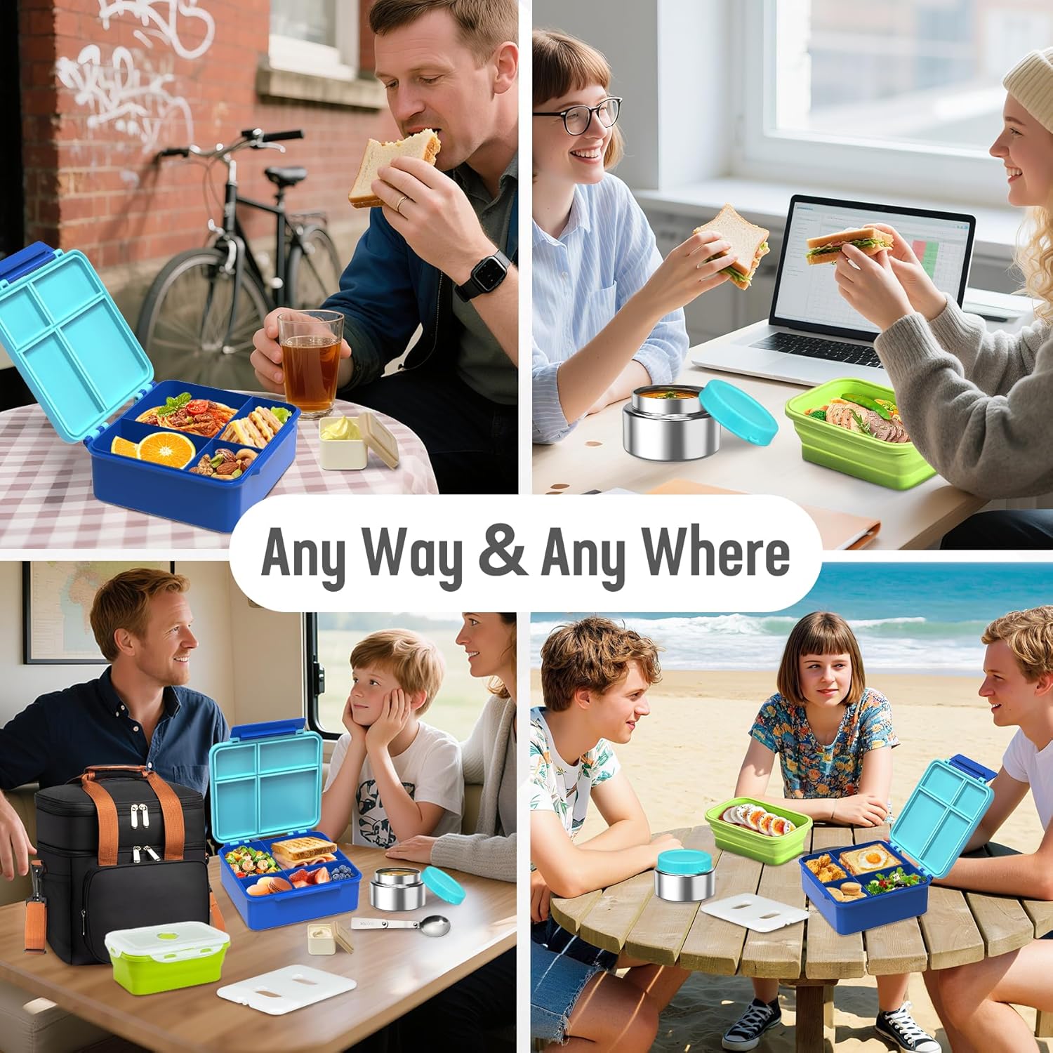 Adult Lunch Box Insulated Leak Proof Meal Prep Kit with 4-Compartment, Kids Soup Thermos for Hot & Cold Food, Lunch Box Containers for Men Women, Lunch Cooler Bag with Ice Pack for Work (Blue)