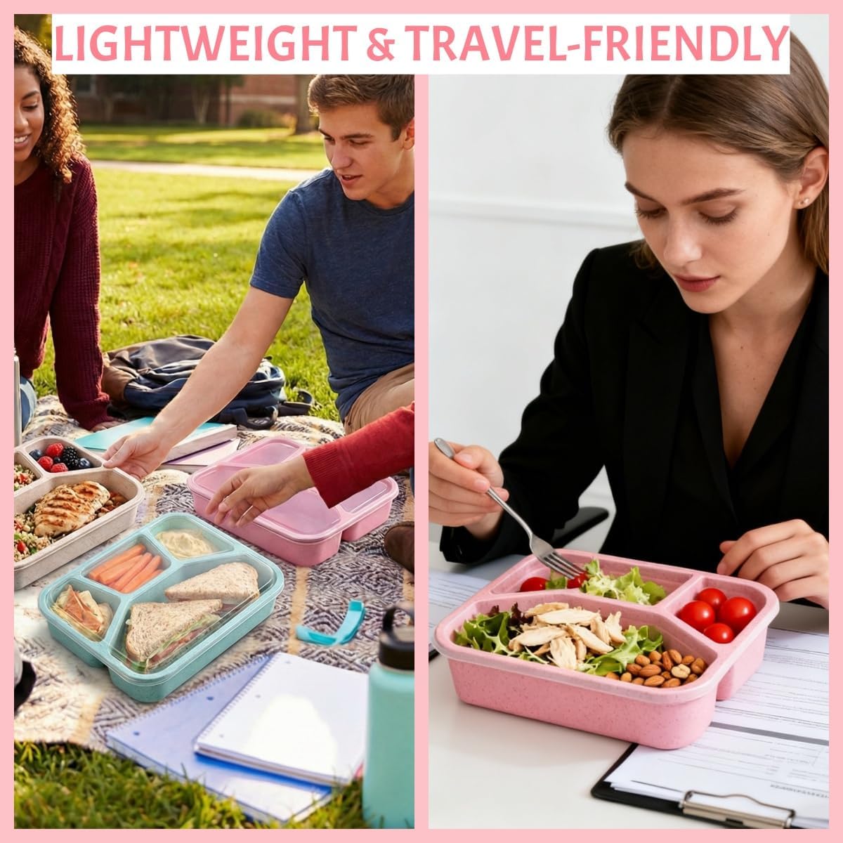 Our 4-compartment bento lunch boxes are top-tier meal prep containers reusable and versatile snack boxes—combining safety, sustainability, and convenience for eco-conscious lifestyles. Crafted from BPA-free wheat straw and food-grade PP, these reusable snack containers with lids replace single-use disposables, supporting green living. Microwave, freezer, and dishwasher safe (remove lids for microwaving), they offer hassle-free meal prep and storage. The divided design enables portion control and keeps foods separate, while transparent lids let you spot contents instantly. Lightweight, compact, and stackable, they fit easily in backpacks or cabinets, ideal for work, travel, picnics, or meal prepping. Available in multi-packs with vibrant colors, these adult-sized containers store sandwiches, salads, snacks, and more—blending functionality with style for everyday use.