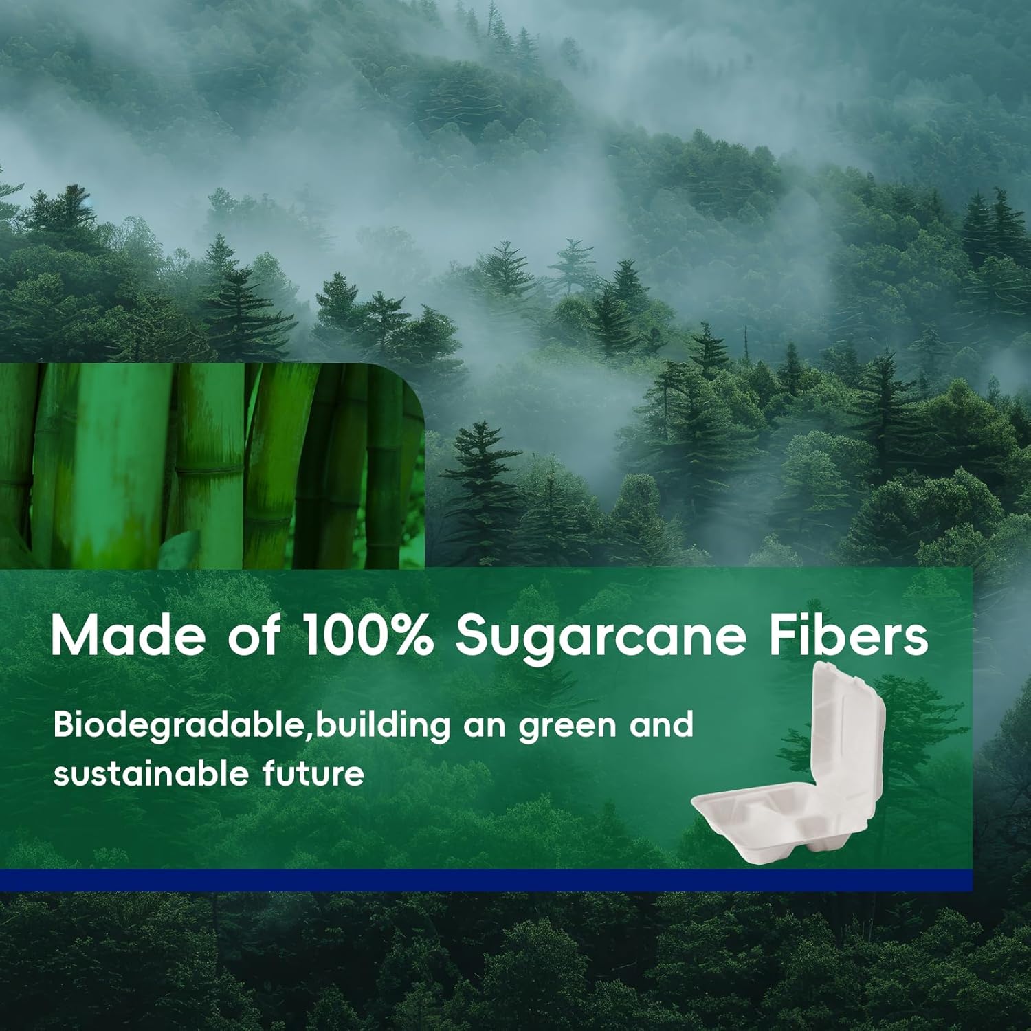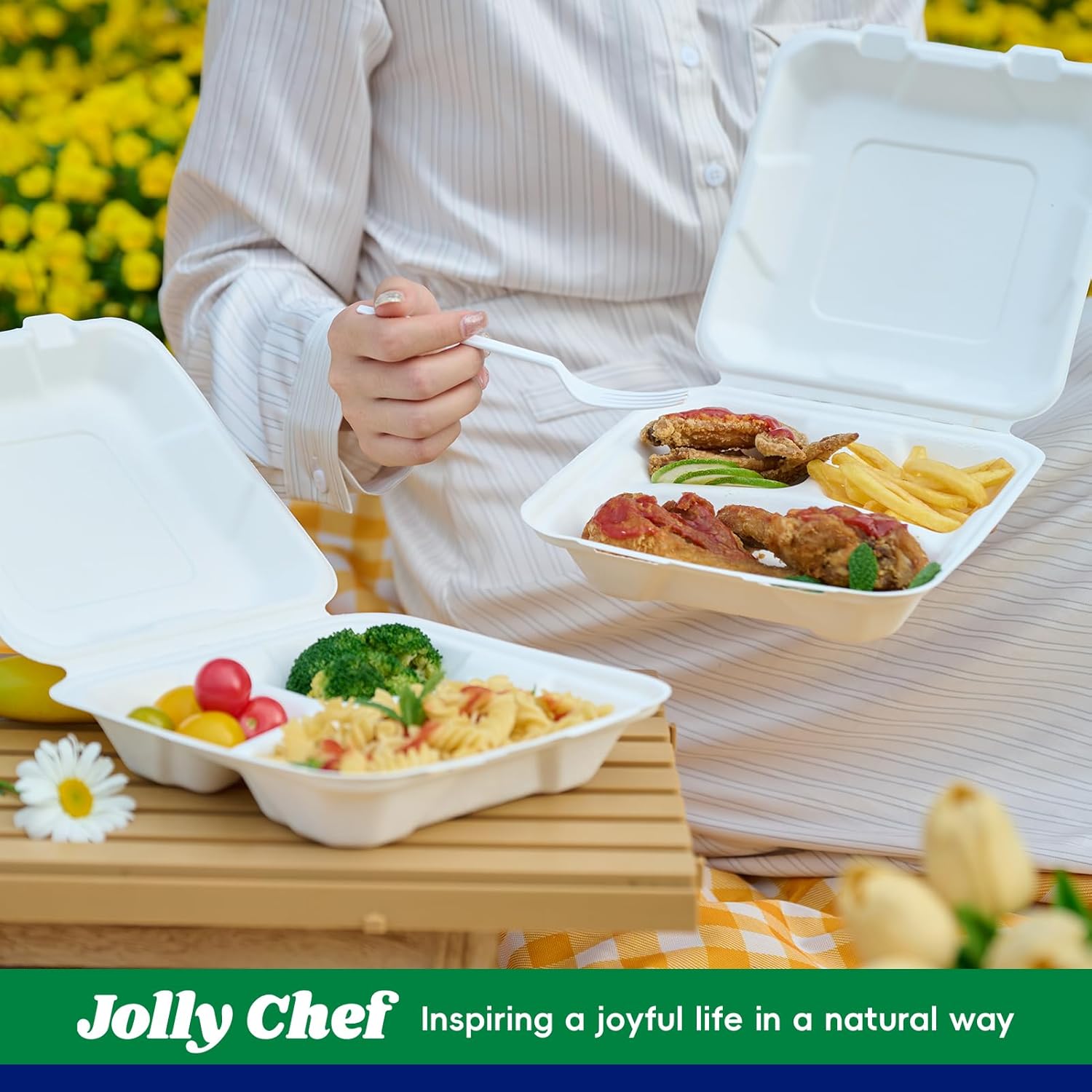 JOLLY CHEF Disposable Clamshell Take Out Food Containers, [8 * 8″ 50-Pack] 3-Compartment Sugarcane Clamshell Takeout Boxes, 50-Pack To Go Boxes for Restaurants & Meal Prep