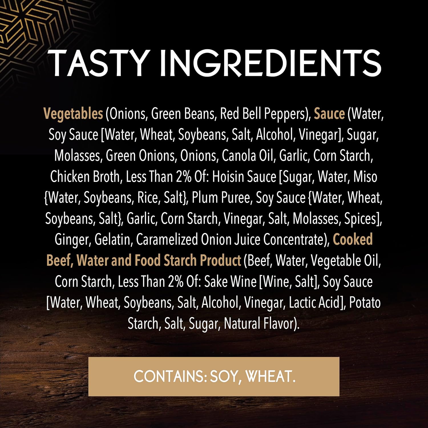 - Frozen dinners contain tender beef with onions, string beans and red bell peppers in sweet and savory sauce