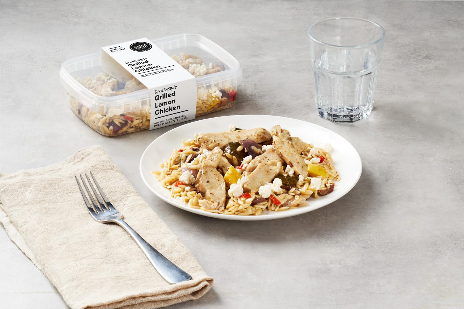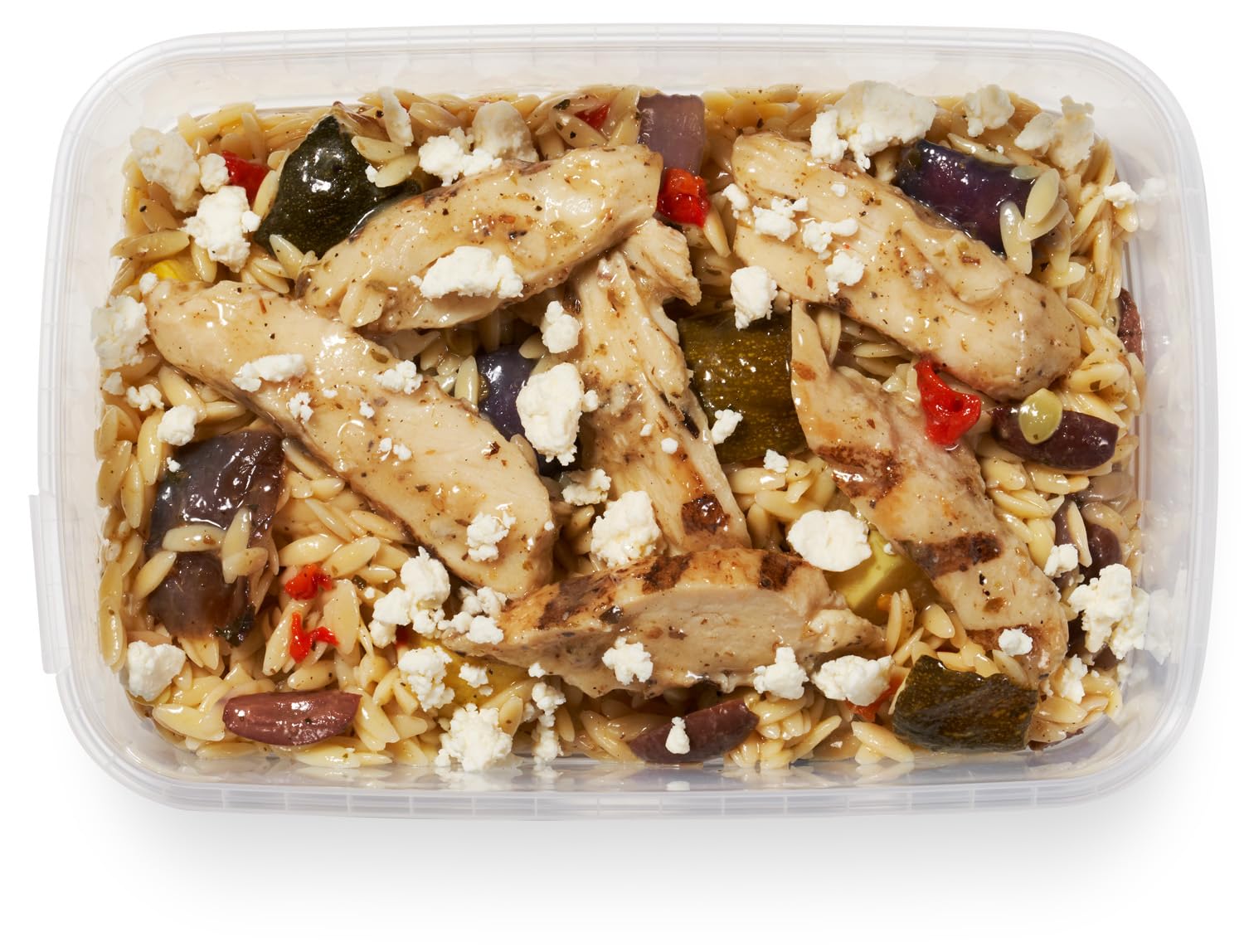 - Greek-style grilled lemon chicken with white meat chicken, orzo, olives & feta cheese