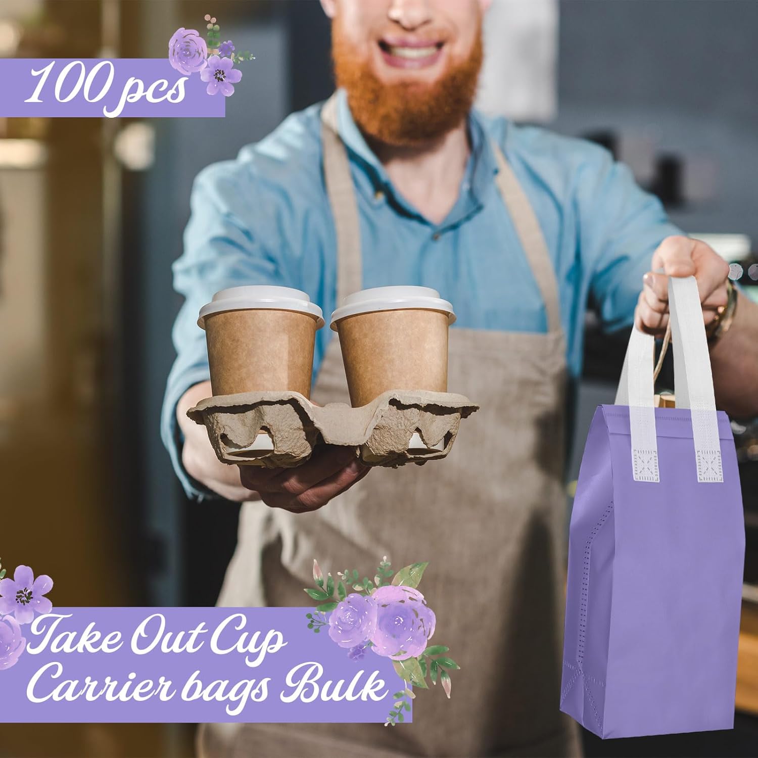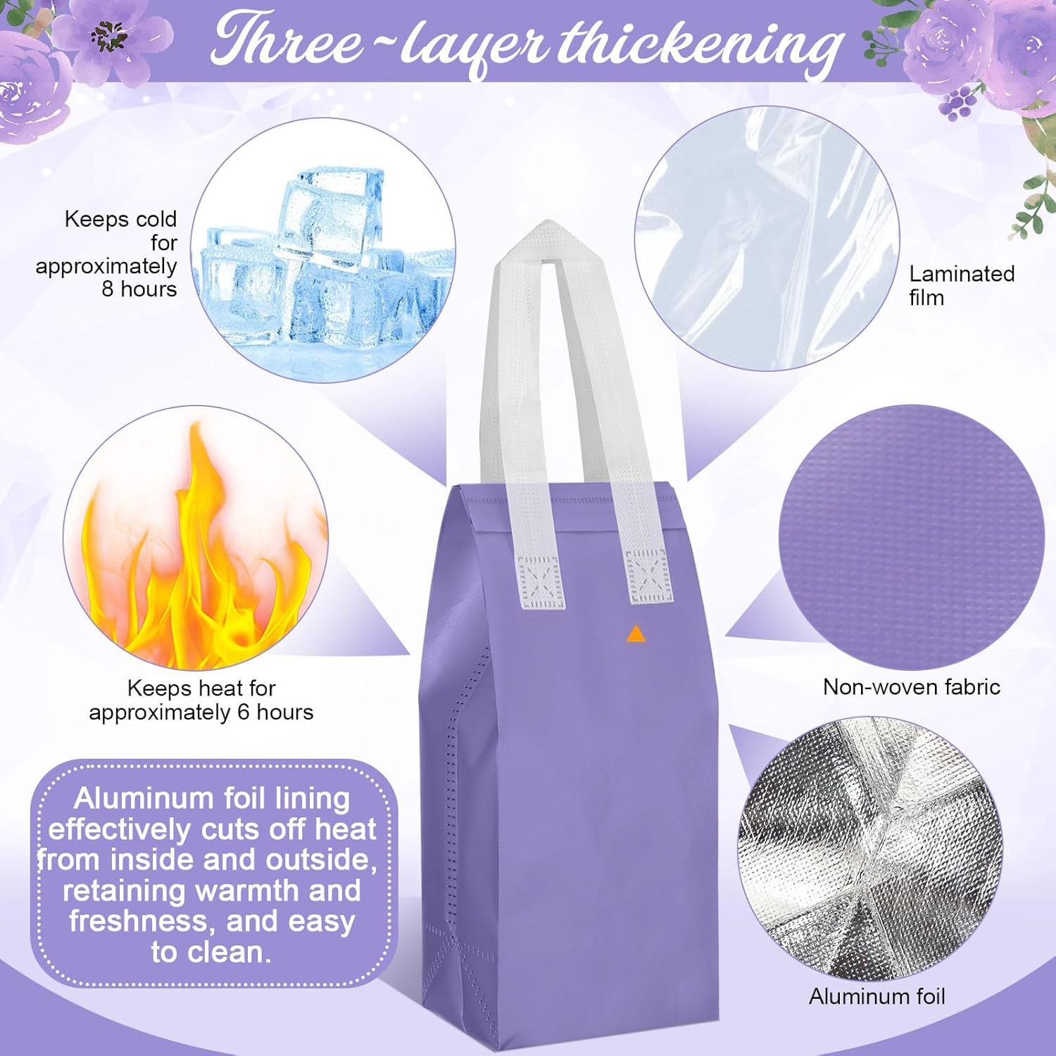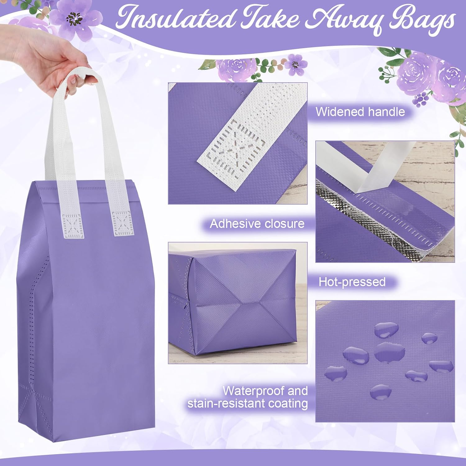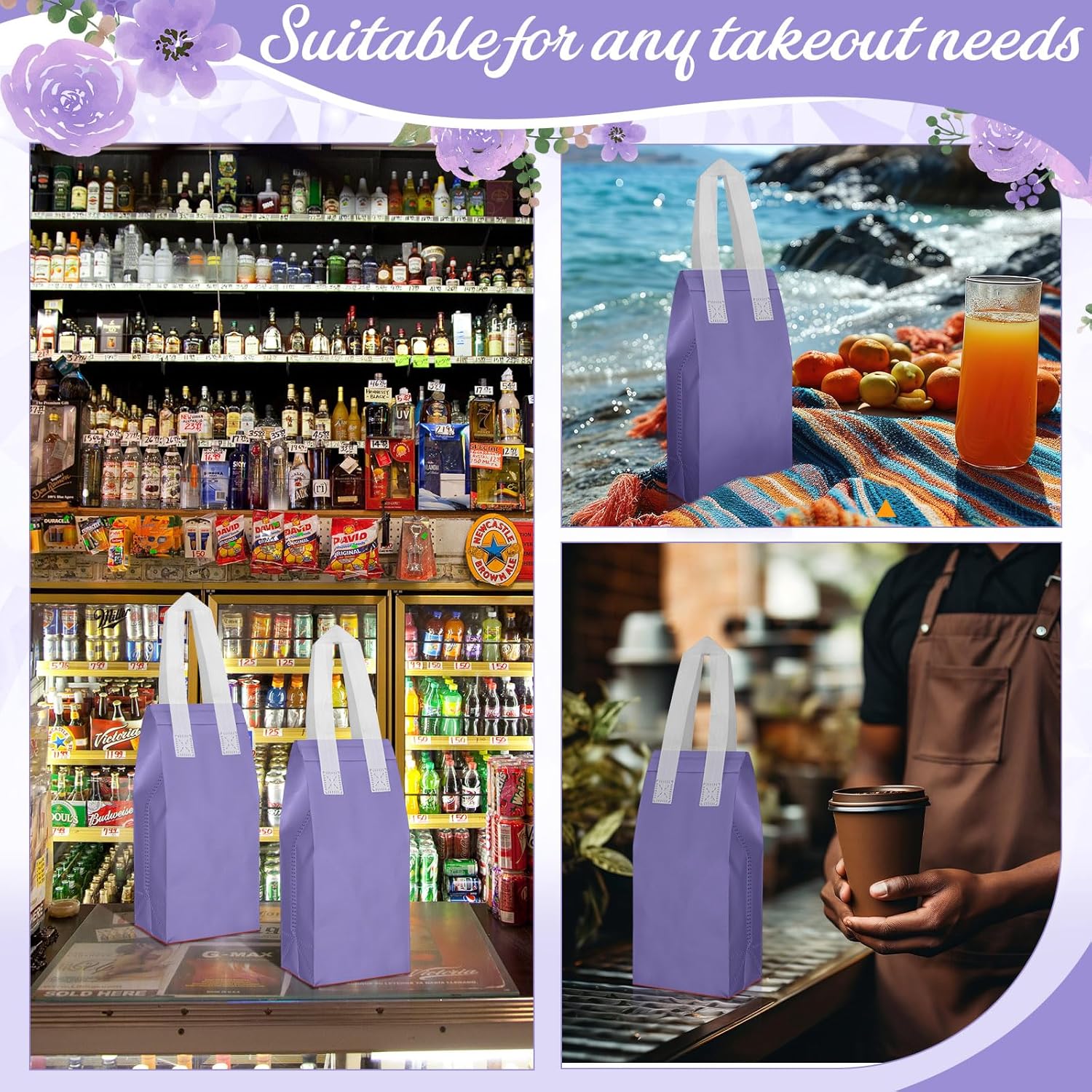 Windyun 100 Pcs Insulated Take Away Bags Bulk Disposable Insulated Lunch Bags for Food Takeaways Coffee Milk Tea Hot Cold Food Fresh Seafood Cooler Restaurant Grocery, 4.7 x 11 x 4 Inches (Purple)