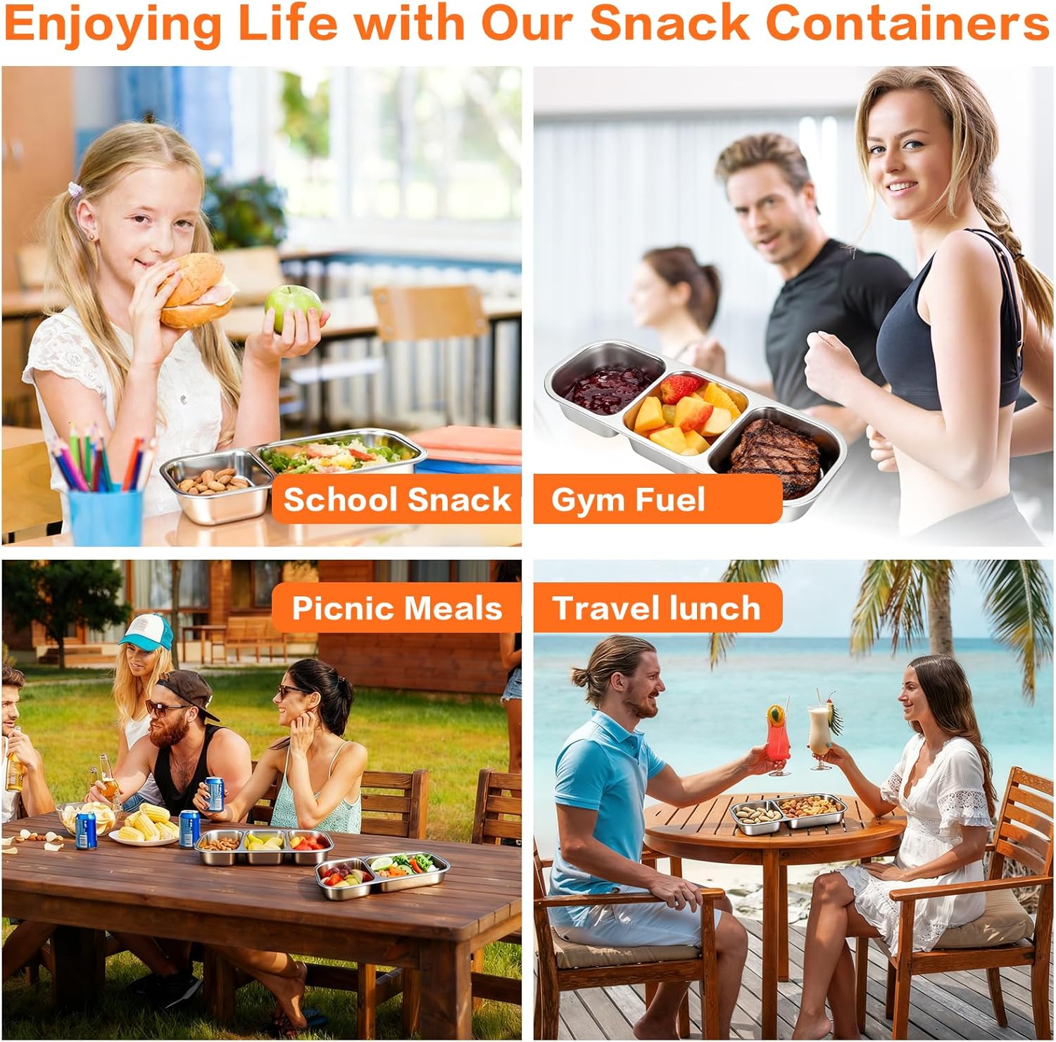 4 pack 3-compartment snack containers with lids.